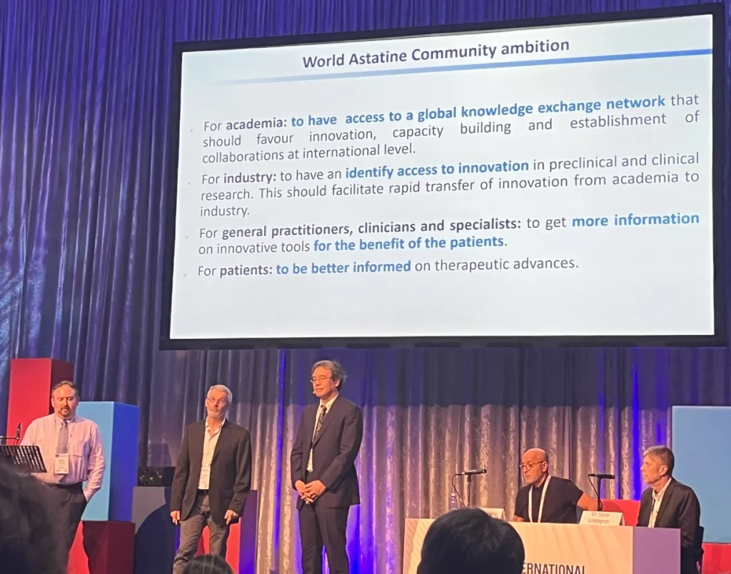 世界でアルファ線核医学治療が注目を浴びる中、近年では多くの学会でアスタチン-211に関する演題が発表されるなど、アスタチン-211への期待も盛り上がっています。アルファフュージョンは、治験入りしたアスタチン-211のパイプラインを持つ世界で唯一の企業です(24年6月7日時点、アルファフュージョン調べ)。その先行した実績を活かし、世界でのアスタチン創薬実現に向けた日米欧の協力体制(World Astatine Community; WAC)の組成をリードしてきました。23年4月には、アルファ線核医学治療の代表的な学会であるTAT12にて、弊社取締役の中野が米国DoE(エネルギー省)・欧州COST-NOAR(アスタチン創薬を目指す欧州の主要プレイヤーが参画するネットワーク)の代表者と登壇し、WACの組成を宣言しました。その後も23年5月のCOST-NOARミーティング、24年3月の7th Theranostics World Congressにてアルファフュージョンは事業の進展を発表し、進んだアスタチン研究の実績をもとにWACの議論をリードしてきました。